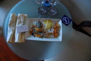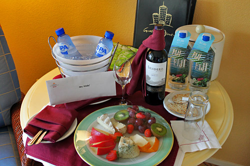 Take a look at the pictures to the side here. The first picture looks really nice, lot’s of cheeses and fruits with nice bottle (1/2) of wine. Can you guess the hotel? Hotel – Marriott
