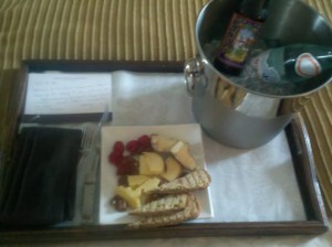 This 4th picture makes me laugh. I was at a full service Marriott in San Diego by Qualcomm stadium (yes, during the power outage). They gave me an entire pack of brie cheese (unwrapped in the box) with an apple and banana. The bottle of wine was so small, why bother with two glasses? Sad tray, and seriously…what am I going to do with a whole box of brie? Hotel – Marriott