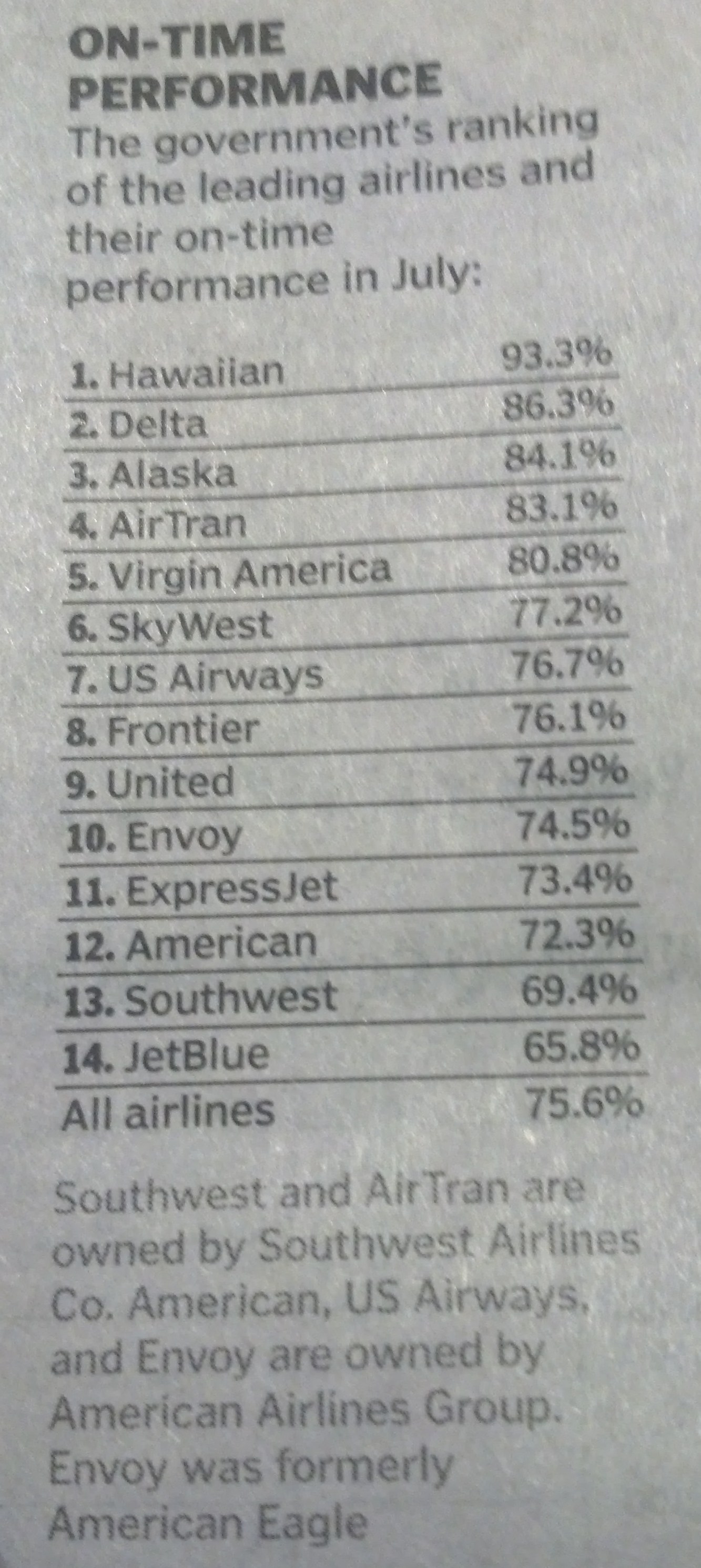 The latest report once again shows Delta on top and JetBlue on the bottom. Discount airlines likes Southwest and JetBlue are on the bottom of this report, month after month, and year after year. What does surprise me is AirTran coming in at #4 above US Airways and well in front of United. I wish I flew Hawaiian every week, it seems they are always on time.